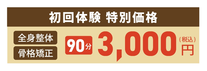 ご新規様限定で、通常初回90分 10,000円(初検料 2,000円+施術料 8,000円)より、7,000円割引いたしまして、3,000円にて施術いたします。